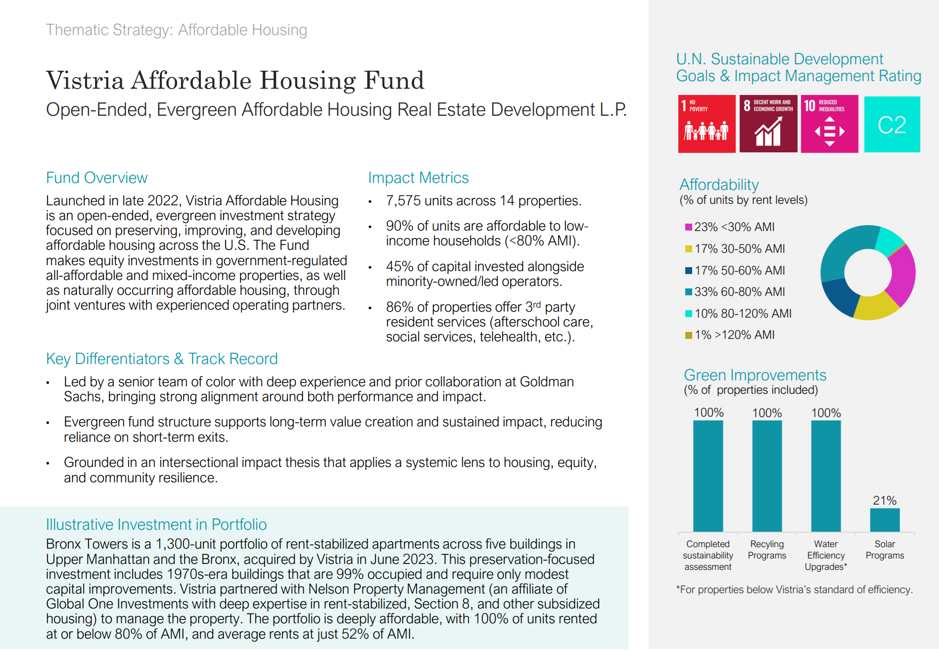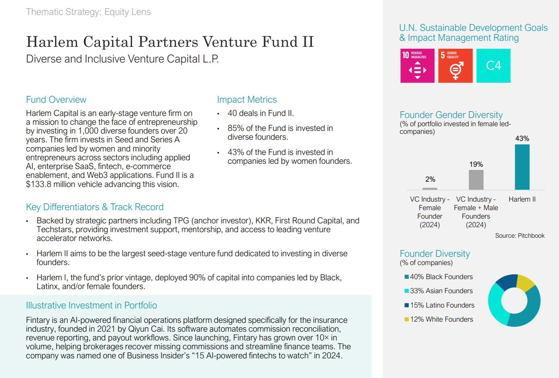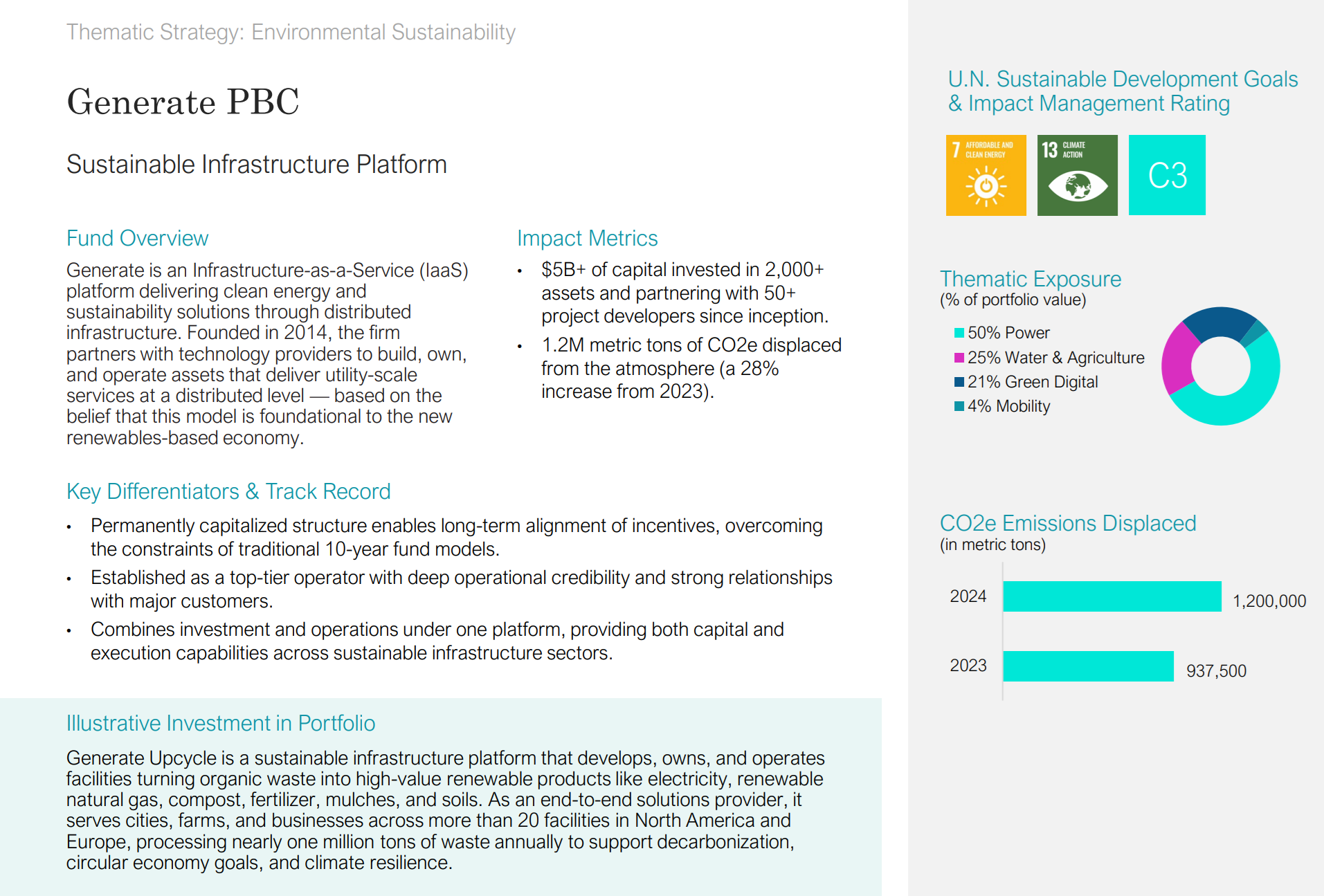 Examples from our portfolio include Generate, Greenbacker, Jonathan Rose Affordable Housing, Global Impact Access Partnership, and Harlem Capital.