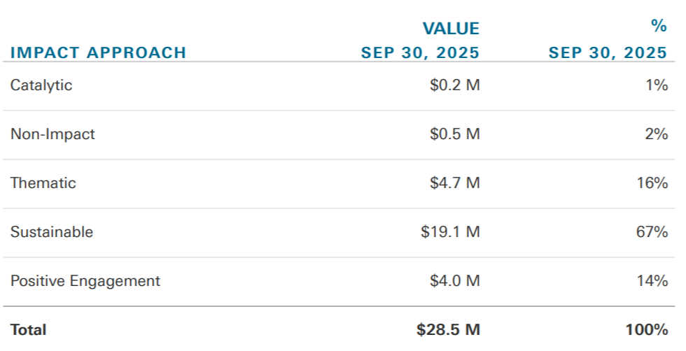 Our investment advisors use the Impact Management Project to evaluate the impact performance of our investments against the U.N. Sustainable Development Goals.